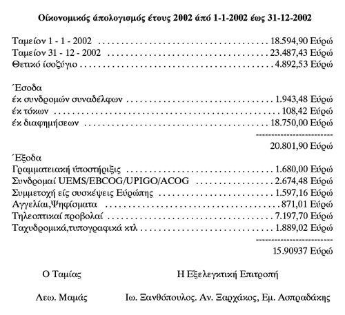 Mετά τόν συνάδελφον κ. Ιώ.Καραντάνην ό Πρόεδρος τής Γενικής Συνελεύσεως συνάδελφος κ. Ηλίας Τριανταφύλλου δίδει τόν λόγον είς τόν συνάδελφον κ.Λεωνίδαν Μαμάν, Ταμίαν τής ΤΕνώσεως ό όποίος παρουσιάζει τόν οίκονομικόν άπολογισμόν τού παρελθόντος έτους διά πρώτην φορά μέ τά σύγχρονα όπτικο-ακουστικά μέσα . Τόσον ό άπολογισμός τού παρελθόντος οίκονομικού έτους 2002 όσον καί ή Εκθεσις τής έξελεγκτικής έπιτροπής τήν όποίαν άνέγνωσε ό Πρόεδρος αύτής συνάδελφος κ. Ιωάννης Ξανθόπουλος παρατίθενται έν συνεχεία. Περαίνων τήν έκθεσίν του ό συνάδελφος κ. Ιω.Ξανθόπουλος πρότεινε τήν άπαλλαγήν άπό πάσης εύθύνης τού Διοικητικού Συμβουλίου τής 'Ενώσεως γεγονός τό όποίο άπεδέχθη ή Γενική Συνέλευσις όμοφώνως.