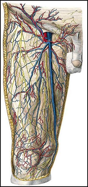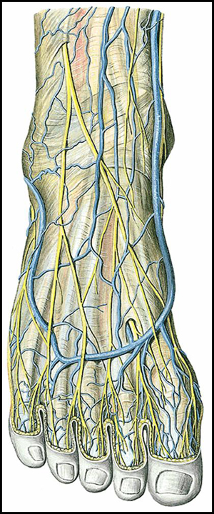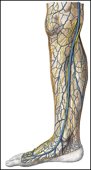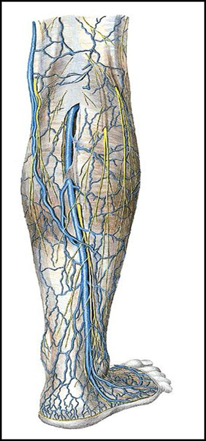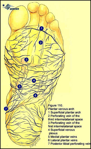 Στα κάτω άκρα, το φλεβικό δίκτυο ξεκινά από το πελματιαίο φλεβικό τόξο (εικόνα