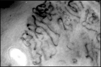 δερματικά τριχοειδή με ειδική μορφολογία δίκην σπειράματος σε ασθενείς με λιποδερματοσκλήρυνση.