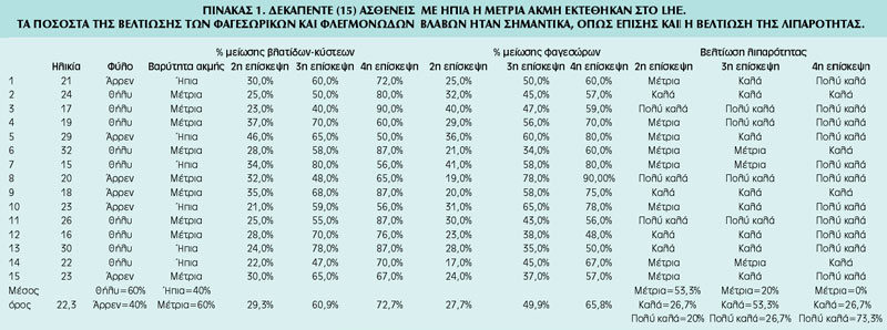 Η μέση μείωση των φλεγμoνωδών βλαβών ήταν 29,3±6,71% τoν πρώτo μήνα, έναντι