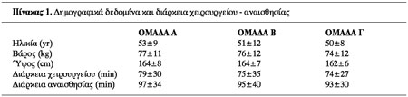 Δεν υπήρξε στατιστικά σημαντική διαφορά ανάμεσα στα δημογραφικά δεδομένα των ομάδων και στη χρονική διάρκεια των χειρουργείων (πίνακας 1).