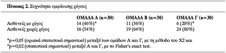 Το μετεγχειρητικό ρίγος ελαττώνεται σημαντικά στην ομάδα Γ (εμφανίζεται μόλις στο 20% των ασθενών που έλαβαν 8mg ονδασετρόνης), σε σύγκριση με την ομάδα ελέγχου (ομάδα Α), στην οποία εμφανίζεται στο 46% των ασθενών. Η διαφορά στην εμφάνιση του ρίγους ανάμεσα στις ομάδες Α και Γ είναι στατιστικά πολύ σημαντική με τη χρήση της μεθόδου του FisherΥs exact test (p=0,02), και οριακά σημαντική με τη μέθοδο του x2 (p=0,05). Στην ομάδα Β εμφάνισαν μετεγχειρητικό ρίγος 11 ασθενείς (ποσοστό 36,6%) και έτσι δεν παρατηρείται στατιστικά σημαντική διαφορά κατά τη σύγκριση με τις δύο άλλες ομάδες (πίνακας 2).