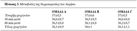 Σε όλες τις ασθενείς παρατηρείται διεγχειρητικά μια σταδιακή ελάττωση της θερμοκρασίας του πυρήνα, η οποία είναι ανάλογη με τη χρονική εξέλιξη του χειρουργείου. Όμως, όταν η μέτρηση γίνεται σε αντίστοιχες χρονικές στιγμές του χειρουργείου, δεν παρατηρείται σημαντική διαφορά της θερμοκρασίας ανάμεσα στις ομάδες (πίνακας 3).