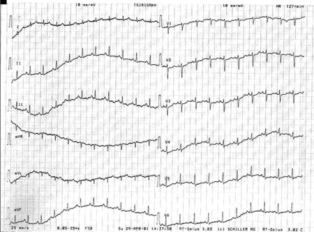 – ΗΚΓ: φλεβοκομβική ταχυκαρδία (ΚΣ = 127/λεπτό) και μη ειδικές αλλοιώσεις, όπως στροφή του άξονα κατά +1700, αρνητικά επάρματα «Τ» στην απαγωγή ΙΙΙ και σχετικά υψηλά επάρματα «R» στις II και V5 απαγωγές (εικόνα 1).
