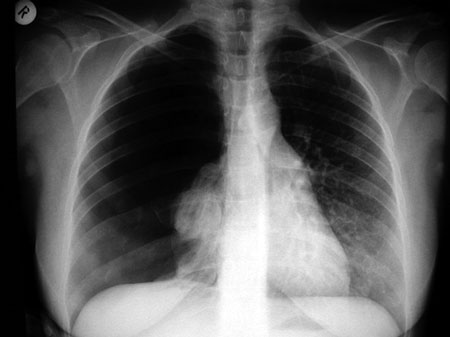 – Ακρόαση πνευμόνων: απουσία αναπνευστικού ψιθυρίσματος σε όλο το δεξιό ημιθωράκιο (σιγή). Ακρόαση αριστερού ημιθωρακίου φυσιολογική.