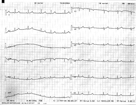 Μετά από δύο ημέρες αποφασίστηκε η αφαίρεση της θωρακικής παροχέτευσης από τον ειδικό θωρακοχειρουργό. Όμως, κατά τον κλινικό και ακτινολογικό έλεγχο της επομένης ημέρας εμφανίστηκε υποτροπή του πνευμοθώρακα και έτσι επανατοποθετήθηκε η θωρακική παροχέτευση. Μετά από δύο ημέρες επιχειρήθηκε εκ νέου η αφαίρεση της παροχέτευσης, η οποία όμως δεν ήταν εφικτή, γιατί ο πνευμοθώρακας υποτροπίασε. Στον καρδιολογικό έλεγχο (με τη θωρακική παροχέτευση σε λειτουργία) το ΗΚΓ παρουσίαζε σαφή μεταβολή: ΚΣ=60/λεπτό, τα αρνητικά «Τ» δεν υπήρχαν, ενώ τα επάρματα «R» στις απαγωγές ΙΙΙ και V5 είχαν μικρύνει (εικόνα 3), στοιχεία που είναι συμβατά με τη μείωση του πνευμοθώρακα σε σύγκριση με αυτόν της εισόδου.