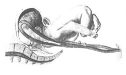 εφαρμογή του εμβρυουλκού Levret σε επόμενη κεφαλή, από το σύγγραμμα του Baudeloque.