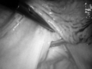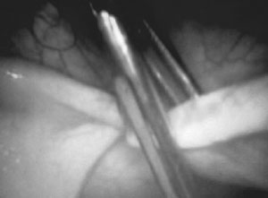 την οπή του τροκάρ εισάγεται η ειδική βελόνα Vecchietti και καθοδηγείται υποπεριτοναϊκά