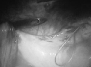 με τη βελόνα Vecchietti, εισάγονται δύο ράμματα από τον κόλπο υπό λαπαροσκοπικό