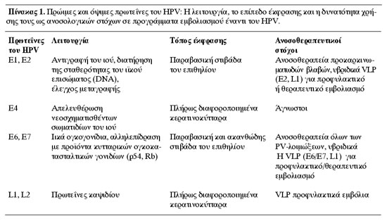 των κυττάρων του επιθηλίου (πίνακας 1). Οι πρωτεΐνες Ε1 και Ε2 εκφράζονται στα