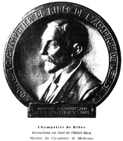 Even during the end of 19th century the surgical intervention during pregnancy was a difficult decision, which may endangered the life of pregnant women. The obstetricians preferred as safest, for this era, the obstetrical operations and the development of rubber metreurynters has been proved quite helpful. The first rubber balloon was introduced by the Viennese professor Carl Braun in 1851 and the second by the French obstetrician tienne Stephane Tarnier in 1862. But Chapentier de Rives working under Tarnier at Maternity of Paris developed a cone shape balloon made by rubber and silk material. This metreurynter was proved more effective and in 1888 published the first 18 successful cases. Most of women referred to this study, suffered retracted pelvis and inertia of uterus. The de Rives cone was proved effective and the method was spread among physicians. Camile Louis Antoine Champetier de Ribes was born in Draveil, France, June 3, 1848. He obtained is medical degree from the Univarsity of Paris.He worked and made his thesis under Tarnier. He first appointed as director at the Maternity of Tenon and then in 1897 he assumed the direction of the Obstetrical Department at the Hospital Htel Dieu of Paris, until 1911. He died in 1 of April 1936, at the age of 86.