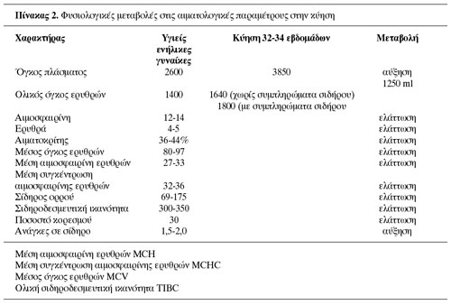 Άσχετα με τα χαμηλά αποθέματα σιδήρου, το έμβρυο έχει την τάση να εξασφαλίζει σίδηρο από τη μητρική τρανσφερρίνη, με τη δέσμευσή του από τον πλακούντα και τη γρήγορη και ενεργητική μεταφορά του στην εμβρυική κυκλοφορία. Σταδιακά ωστόσο, αυτά τα έμβρυα τείνουν να εμφανίσουν χαμηλά αποθέματα σιδήρου εξαιτίας των αντίστοιχων χαμηλών μητρικών αποθεμάτων. Επιπτώσεις με τη μορφή πρόωρων και υπολειπόμενης ανάπτυξης νεογνών και αυξημένα ποσοστά περιγεννητικής θνησιμότητας έχουν παρατηρηθεί σε κυήσεις αναιμικών γυναικών(12). Η αγωγή με συμπληρώματα σιδήρου βελτιώνει το περιγεννητικό αποτέλεσμα. Το μέσο βάρος στον τοκετό, το Apgar score και τα επίπεδα αιμοσφαιρίνης 3 μήνες μετά τον τοκετό ήταν σημαντικά υψηλότερα στα παιδιά των γυναικών της ομάδας υπό αγωγή με συμπληρώματα σιδήρου, από ό,τι της ομάδας υπό αγωγή με placebo(13). Oι φυσιολογικές μεταβολές στις αιματολογικές παραμέτρους κατά τη διάρκεια της κύησης φαίνονται στον πίνακα 2 και οι κατηγορίες αναιμίας στον πίνακα 3.