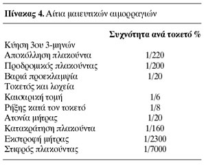 Τα αίτια των αιμορραγιών στη Μαιευτική φαίνονται στον πίνακα 4(31). Μεταξύ 7 έως 37% των μεταγγίσεων ερυθρών στη Μαιευτική αφορούν σε περιπτώσεις προδρομικού πλακούντα και το 50% αυτών αντιμετωπίζονται με καισαρική τομή(32,46).