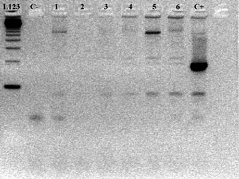 Εικόνα 1. Αποτελέσματα γενετικού ελέγχου με PCR: σε καμία από τις ασθενείς δεν βρέθηκε το TSPY γονίδιο. L123: ladder, κλίμακα σήμανσης, C-: φυσιολογική γυναίκα, C+: φυσιολογικός άνδρας, 1,2,3,4,5,6: αντίστοιχοι ασθενείς.