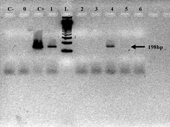 Εικόνα 2. Αποτελέσματα γενετικού ελέγχου με nested PCR: στις ασθενείς 1 και 4 αναγνωρίστηκε η παρουσία του TSPY γονιδίου. L:ladder, κλίμακα σήμανσης, C-: φυσιολογική γυναίκα, C+: φυσιολογικός άνδρας, 1,2,3,4,5,6: αντίστοιχοι ασθενείς.