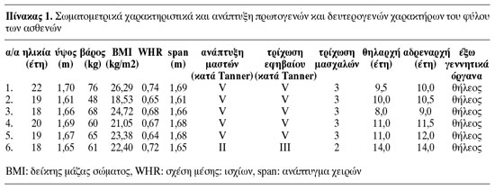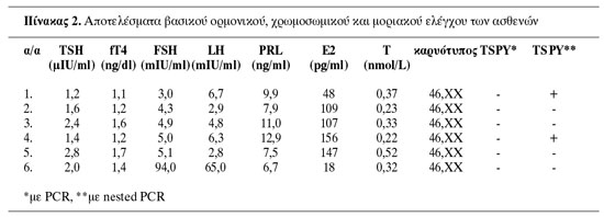 Στη μελέτη συμπεριλήφθηκαν έξι ασθενείς, μέσης ηλικίας 19.2 ±1.8 έτη (μέση τιμή ± SD), που προσήλθαν στην Ενδοκρινολογική Κλινική του Γ.Ν. Θεσσαλονίκης «Ιπποκράτειο» λόγω πρωτοπαθούς αμηνόρροιας, κατά τα έτη 2000-2001.