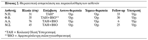 Τα στοιχεία που αφορούν την ηλικία των ασθενών, τον τύπο της διενεργηθείσας χειρουργικής επέμβασης, τη μετεγχειρητική θεραπεία, το χρόνο και τα αποτελέσματα της μετεγχειρητικής παρακολούθησης παρουσιάζονται συνοπτικά στον πίνακα 2. Τρεις ασθενείς υποβλήθηκαν σε κοιλιακή ολική υστερεκτομή μετά των εξαρτημάτων, ενώ σε μία ασθενή έγινε κοιλιακή ολική υστερεκτομή άνευ των εξαρτημάτων. Καμία από τις ασθενείς δεν υποβλήθηκε σε μετεγχειρητική ακτινοθεραπεία ή χημειοθεραπεία. O χρόνος της μετεγχειρητικής παρακολούθησης κυμάνθηκε μεταξύ 6 και 33 μηνών (μέσος όρος 23,5 μήνες). Κατά τη μετεγχειρητική παρακολούθηση καμία από τις ασθενείς δεν εμφάνισε τοπική υποτροπή ή απομακρυσμένες μεταστάσεις.