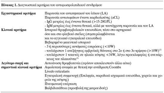 Το αντιφωσφολιπιδικό σύνδρομο (ΑΦΣ) είναι μια επίκτητη νοσολογική οντότητα αυτοάνοσης αιτιολογίας, η οποία εντάσσεται στο ευρύτερο πλαίσιο των προθρομβωτικών θρομβοφιλικών καταστάσεων. Περιγράφηκε αρχικά σε ασθενείς που έπασχαν από συστηματικό ερυθηματώδη λύκο (ΣΕΛ), αλλά τα ίδια κλινικά και εργαστηριακά χαρακτηριστικά εντοπίστηκαν και σε ασθενείς που δεν πληρούσαν τα υπόλοιπα διαγνωστικά κριτήρια του ΣΕΛ. Έτσι, το ΑΦΣ χαρακτηρίζεται ως δευτεροπαθές ή πρωτοπαθές αντίστοιχα. Τα διαγνωστικά κριτήρια που ισχύουν σήμερα τέθηκαν το 1999 και είναι γνωστά ως κριτήρια του Sapporo.(1) Με βάση αυτά, προκειμένου να τεθεί η διάγνωση του πρωτοπαθούς αντιφωσφολιπιδικού συνδρόμου, πρέπει να υπάρχει τουλάχιστον ένα εργαστηριακό και ένα κλινικό κριτήριο, όπως αυτά φαίνονται στον πίνακα 1.