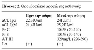 Στο ατομικό αναμνηστικό της ασθενούς αναφέρονται 3 επαναλαμβανόμενες αυτόματες εκτρώσεις, ενώ η διάγνωση του αντιφωσφολιπιδικού συνδρόμου είχε τεθεί πριν την έναρξη της προαναφερθείσας κύησης. Για τον λόγο αυτό, καθΥ όλη τη διάρκεια της κύησης είχε τεθεί σε αγωγή με 80mg ακετυλοσαλικυλικού οξέος, 5000iu δαλτεπαρίνη (Fragmin) και 10mg μεθυλπρεδνιζολόνη ημερησίως. Η παραπάνω αγωγή διακόπηκε ατυχώς αμέσως μετά την καισαρική τομή. Στην κλινική μας πραγματοποιήθηκε εργαστηριακός έλεγχος του θρομβοφιλικού προφίλ της ασθενούς και συγκρίθηκε με τον αντίστοιχο έλεγχο που είχε πραγματοποιηθεί κατά τη διάρκεια της κύησης. Τα αποτελέσματα φαίνονται στον πίνακα 2.