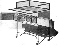 Ένας άλλος Αμερικανός Παιδίατρος, ο Thomas Morgan Rotch (1849-1914) (εικόνα 19), που διάθετε μεγάλη κοινωνική προβολή, παρουσίασε έναν αξιόλογο νέο τύπο θερμοκοιτίδας, γύρω στις αρχές του εικοστού αιώνα (εικόνα 20). Ένας άλλος Αμερικανός ιατρός που εργάστηκε στο πεδίο αυτό, ήταν ο Martin Arthur Couney (1870-1950) (εικόνα 21). Αντίθετα με τους δύο προηγούμενους, αυτός υπήρξε μια αμφιλεγόμενη προσωπικότητα. Παρόλο που είχε κάνει μετεκπαίδευση κοντά στον καθηγητή Budin στο Παρίσι, ακολούθησε έναν περίεργο δρόμο προς την επιτυχία. Έκανε δημόσιες επιδείξεις θερμοκοιτίδων με νεογέννητα σε διεθνείς εκθέσεις, αλλά ακόμη και σε λαϊκά πανηγύρια. Εδώ πρέπει να πούμε ότι ο πρώτος διδάξας προς αυτή την κατεύθυνση ήταν ο προαναφερθείς Γάλλος ιατρός Lion, που εμφάνιζε νεογέννητα σε θερμοκοιτίδες σε λαϊκές εκδηλώσεις, αλλά και σε ειδικά διαμορφωμένους χώρους στη Λυών, στη Μασσαλία και στο Παρίσι, έναντι εισιτηρίου (εικόνα 22). Όμως, ο μαθητής του Couney, τον ξεπέρασε κατά πολύ. Εκείνος έκανε και άλλες ανορθόδοξες ενέργειες και εφάρμοσε διάφορες διαφημιστικές τακτικές και καμπάνιες, που οδήγησαν στην πλήρη εμπορευματοποίηση των θερμοκοιτίδων. Το γεγονός αυτό είχε ως αποτέλεσμα την εμφάνιση πολλών επικριτικών δημοσιευμάτων τόσο στον ημερήσιο τύπο, όσο και στα ιατρικά περιοδικά, που καταδίκαζαν αυτές τις ενέργειες.(9) Αυτές και άλλες παρόμοιες εκδηλώσεις κράτησαν μέχρι το 1939. Μετά τον 2ο Παγκόσμιο Πόλεμο, τα πράγματα πήραν τη σοβαρή και καθαρά τεχνική και επιστημονική μορφή και τη δεκαετία του 1960, οι θερμοκοιτίδες πια έχουν φτάσει σε ικανοποιητική κατασκευαστική μορφή (εικόνα 23). Προτού κλείσω αυτήν τη σύντομη ιστορική αναδρομή σχετικά με τις θερμοκοιτίδες, κρίνεται σκόπιμο να αναφερθούν δύο ονόματα επιστημόνων που καθιέρωσαν την Παιδιατρική και τη Νεογνολογία. Πρώτα αναφέρεται ο Julius Η. Hess (εικόνα 24). Ο Hess διατέλεσε καθηγητής της Παιδιατρικής στο Πανεπιστήμιο του Illinois και ίδρυσε το 1914 την πρώτη εντατική μονάδα παρακολούθησης νεογέννητων, στο φημισμένο Νοσοκομείο Michael Reese στο Σικάγο. Επίσης, σχεδίασε πετυχημένες θερμοκοιτίδες, θερμαινόμενες με ηλεκτρικό ρεύμα (εικόνα 25). Μεταξύ της άλλης του προσφοράς, μια φορητή θερμοκοιτίδα που είχε σχεδιάσει για τη μεταφορά νεογέννητων είχε ιδιαίτερη απήχηση και εμπορική επιτυχία (εικόνα 26).