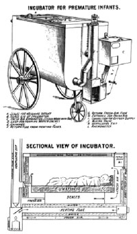 Incubators were referred for first time in ancient Alexandria for the hatching of eggs, that made the assumption of a possible use of this method in the new born, however, Soranus of Ephesus 1rst century A.C. who has been considered the father of Obstetrics does not make any mention of that in his special book "apotexis". Thus we return to Hippocrates΄ statement, during the classic ancient Greek era "no fetus coming into the world before the seventh month of pregnancy can be saved". Until 1857, besides the recording of a small number a case of premature newborns survived with the help of warm environment, nothing important was published. During the mentioned before year the French professor Jean Luis Paul Denuce (1824-1889) in Bordeaux described his incubator consisted of a double - walled tub which was filled with warm water. The German professor of Obstetrics Carl Siegmund Crede (1819-1894) in 1884 published in 1884 the results obtained with a similar apparatus in use in his clinic in Leipzig since 1860, which was able to lower the mortality of premature newborns by 18 per cent. The first closed incubator was build according his instructions for the French professor of Obstetrics Etienne Stephane Tarnier (1828-1897) by Odile Martin director of the Paris Zoo in 1860. This apparatus may be qualified as modern and it was the principle of our day incubators. A .Auvard (1855-1941) published in 1883 a very important study that gives the first statistics on the use of incubator in the Maternity of Paris under the direction of Tarnier. Berthaut an intern at the same clinic made a excellent thesis in 1887, adding new data of over a thousand cases on the conditions indicating the use of an incubator in the newborn infant. Dr Budin was the supervisor of the previous study was member of the staff and successor of Tarnier in the administration of the clinic. Professor Pierre Constantin Budin (1846-1907) has been considered as one of the fathers of Neonatology. In 1900 presented an interesting book called "The Nursling". In 1891 the French obstetrician Bonnaire published on the administration of oxygen in the newborn also in the Tarnier clinic. In 1896 the French physician Alexandre Lion built a metal incubator provided for automatic heat, as well as control of ventilation and humidity. In the U.S.A. from the original Lion΄s type were produced the models of Couney and DeLee. Professor Joseph Bolivar DeLee (1869-1950) established the Chicago maternity hospital and besides his other scientific interests he provided excellent care for the newborns. In the contrary, Cooney made a career of public expositions his incubator with premature newborns and commercialized extremely the event, he has been proved the best pupil of Lion who started first the incubator-baby side shows. Cooney participated in world fairs, expositions and amusement parks until 1939. We like to refer two outstanding scientists professor Julius H. Hess, who established in 1914 the special care nursery at Michael Reese Hospital in Chicago and authorised the first American textbook about care of premature infants in 1922 and professor Abraham Jacobi (1830-1919) had a great interest for newborns and he fought with passion to reduce infant mortality. The last is often referred to as the father of American Pediatrics. Throughout twentieth century and at the beginning of 21st baby-incubators and neonatal units coexists and almost it may be consider them as synonymous.