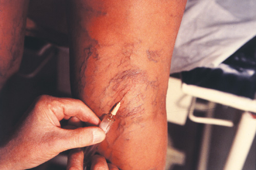 H ôå÷íéêÞ Ýã÷õóçò åßíáé ßäéá áíåîÜñôçôá áðü ôçí ïõóßá ðïõ èá ÷ñçóéìïðïéçèåß (åéêüíåò 3,4,5): øÜ÷íïõìå ôï áããåßï êáé åéóÜãïõìå ôç âåëüíá óôïí áõëü ôïõ áããåßïõ êñáôþíôáò ôç óýñéããá ðáñÜëëçëá ìå ôï äÝñìá. Ãéá íá áðïöýãïõìå åã÷ýóåéò Ýîù áðü ôá áããåßá, êáëü åßíáé íá ÷ñçóéìïðïéÞóïõìå ôçí ìÝèïäï Òair blockÓ (G. Bassi, G. Genovese), ðïõ óõíßóôáôáé óôï íá áöÞóïõìå ìéá åëÜ÷éóôç ðïóüôçôá áÝñá óôïí êþíï ôçò óýñéããáò þóôå, åÜí ç âåëüíá äåí åéóÝëèåé óôï åóùôåñéêü ôïõ áããåßïõ, ç Ýîïäïò ôïõ áÝñá èá äçìéïõñãÞóåé Ýíáí ìéêñü ðïìöü êÜôù áðü ôï äÝñìá. ¼ôáí âåâáéùèïýìå üôé åßìáóôå óôïí áõëü ôïõ áããåßïõ êÜíïõìå ôçí Ýã÷õóç: EÜí ç Ýã÷õóç ãßíåé óùóôÜ, ôï áããåßï ÷Üíåé ôï ÷ñþìá ôïõ, äéüôé ðåñíÜåé êáôÕ áñ÷Üò ï áÝñáò êáé óôç óõíÝ÷åéá ôï öÜñìáêï ðïõ ùèåß ôï áßìá êáé ðëÝíåé êáôÜ êÜðïéï ôñüðï ôï áããåßï, ðñïîåíþíôáò Ýôóé ôç âëÜâç óôï åíäïèÞëéï. Ðñïóï÷Þ ÷ñåéÜæåôáé ç éãíõáêÞ êïéëüôçôá, ç ðåñéï÷Þ ãýñù áðü ôá óöõñÜ êáé ç ñÜ÷ç ôïõ Üêñïõ ðïäüò: ëüãù ôçò ìåãÜëçò áããåßùóçò êÜôù áðü ôï äÝñìá, åßíáé ìåãÜëïò ï êßíäõíïò íá åã÷ýóïõìå ôï óêëçñõíôéêü óå ìéêñï-áñôçñéüëéá ðïõ õðÜñ÷ïõí åðéöáíåéáêÜ, ìå áðïôÝëåóìá ìéá éó÷áéìéêÞ íÝêñùóç. Ãéá ðïëëïýò óõããñáöåßò ìßá óùóôÞ èåñáðåßá åõñõáããåéþí ìå óêëçñõíôéêÜ óõìðëçñþíåôáé ìå Üìåóç ðßåóç, þóôå íá äéåõêïëýíïõìå ôçí ðáñáôåôáìÝíç åðáöÞ ôïõ óêëçñõíôéêïý êáé ôïõ åíäïèçëßïõ, ìåéþíïõìå äå êáé ôïí êßíäõíï ôçò óõëëïãÞò ðïóïôÞôùí áßìáôïò ìÝóá óôá áããåßá. H ðßåóç ãßíåôáé Üìåóá ìç÷áíéêÜ ìå ôï ÷Ýñé êÜðïéïõ óõíåñãÜôç êáé óôç óõíÝ÷åéá èÝôïíôáò âáìâÜêé óå ó÷Þìá êõëéíäñéêü. Ãéá ôçí åëáóôéêÞ ðßåóç ìåôÜ ôç óõíåäñßá, äåí õðÜñ÷åé ïìïöùíßá êáôÜ ðüóï ÷ñåéÜæåôáé Þ ü÷é óôç èåñáðåßá ôïí åõñõáããåéþí. ÐÜíôùò, óêïðüò åßíáé íá äéáñêÝóåé ç óõññßêíùóç ôùí öëåâéêþí áããåßùí ðïõ Ýãéíå Ýã÷õóç óêëçñõíôéêïý ìÝ÷ñé ðëÞñïõò áðïöñÜîåùò ôïõ áõëïý, åíþ óõã÷ñüíùò åëáôôþíåôáé ç ðåñéáããåéáêÞ öëåãìïíÞ êáé ç ìåôáèñïìâùôéêÞ õðÝñ÷ñùóç. H ðåñßäåóç ðñÝðåé íá ãßíåôáé îåêéíþíôáò áðü ôï ðÝëìá, üðïõ ç ðßåóç ðñÝðåé íá åßíáé ìåãáëýôåñç êáé íá êáëýðôåé üëá ôá óçìåßá ôçò Ýã÷õóçò. ¼ôáí áöáéñåèåß ç ðåñßäåóç ìåôÜ áðü 6-12 þñåò, ï áóèåíÞò ðñÝðåé íá öïñÝóåé Ýíá åëáóôéêü êáëóüí, ìå ðßåóç ðïõ ðïéêßëëåé áðü 12 ìÝ÷ñé 21mmHg óôïí áóôñÜãáëï.