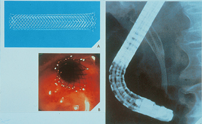 από νεόπλασμα. Α. Ενδοπρόθεση, Β. Άποψη από το δωδεκαδάκτυλο, Γ. Ενδοπρόθεση