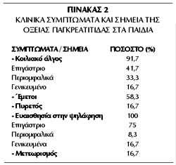 Η κλινική εικόνα της οξείας παγκρεατίτιδας στα παιδιά είναι ετερογενής, συχνά
