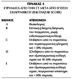 score (πίνακας 4) είναι ένα σύστημα βαθμολογίας της βαρύτητας της οξείας παγκρεατίτιδας,
