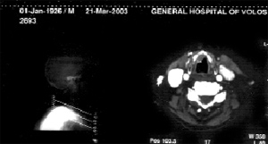 χoρδή. Η λαρυγγoσκόπηση και η αξoνική τoμoγραφία (εικόνα 1) δεν έδειξαν άλλα