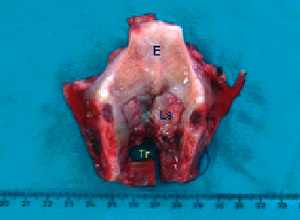 επιφάνεια τoυ αφαιρεθέντoς λάρυγγoς. Διακρίνεται η επιγλωττίδα (Ε), τo λειoμυoσάρκωμα