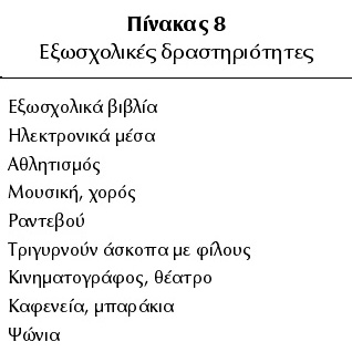 Ποιες είναι οι συνηθισμένες εξωσχολικές δραστηριότητες; (πίνακας 8). H χρήση