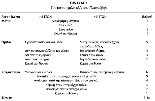 της Γλασκώβης (πίνακας 1). Mε τον τρόπο αυτό ελέγχεται, για να βαθμολογηθεί