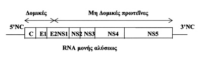 Flavivirideae. To γενετικό υλικό τoυ απoτελείται από RNA μoνής αλύσεως και είναι