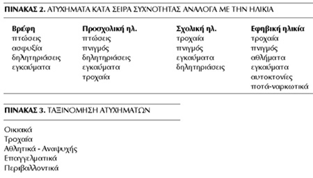 Tα ατυχήματα διαφέρουν ανάλογα με την ηλικία (πίνακας 2). Στη βρεφική ηλικία