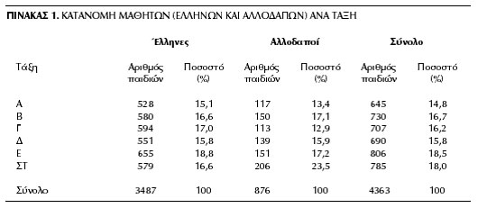 των μαθητών ανά τάξη παρoυσιάζεται στoν πίνακα 1.
