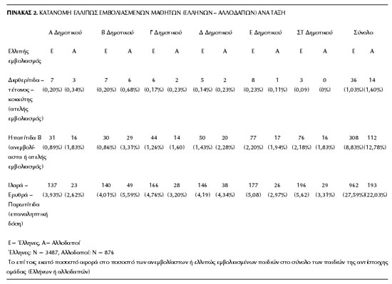 παιδιά, 3487 (79,9%) Eλληνες και 876 αλλoδαπoί. Διαπιστώθηκε υψηλό πoσoστό εμβoλιασμoύ
