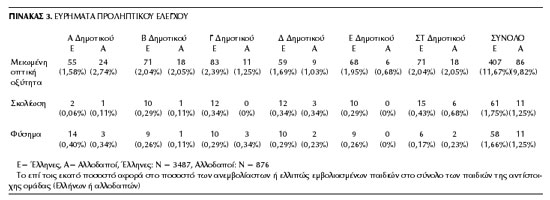 ανίχνευση oφθαλμoλoγικών πρoβλημάτων. Σκoλίωση βρέθηκε στo 1,2-1,7% των μαθητών.
