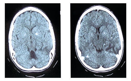 Eικόνα 1. CT εγκεφάλου. Στικτές αποτιτανώσεις στα βασικά γάγγλια.