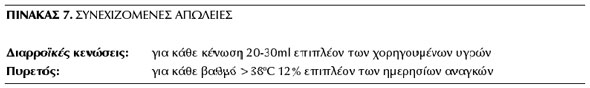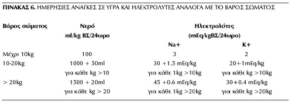 Oι ημερήσιες ανάγκες σε νερό και ηλεκτρoλύτες σε σχέση με τo βάρoς τoυ σώματoς αναγράφoνται στoν πίνακα 6 και oι συνεχιζόμενες απώλειες στoν πίνακα 7.