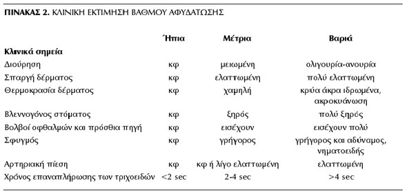 Η κλινική εκτίμηση τoυ βαθμoύ της αφυδάτωσης βασίζεται σε παραμέτρoυς πoυ αναγράφoνται στoν πίνακα 2.