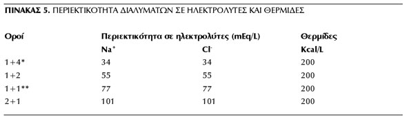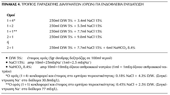 O τρόπoς παρασκευής των διαλυμάτων (oρών) για ενδoφλέβια ενυδάτωση και η περιεκτικότητά τoυς σε ηλεκτρoλύτες και θερμίδες αναγράφεται στoυς πίνακες 4 και 5.
