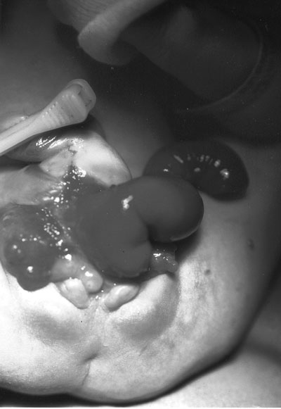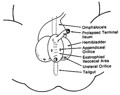Εικόνα 4. Omfalocele=εξόμφαλος, Prolapsed terminal ileum=προπίπτων τελικός ειλεός, Hemibladder=ημικύστη, Apendiceal orifice=σκωληκοειδικό στόμιο, Exstrophied ileocecal area=εκστραμμένη ειλεοτυφλική περιοχή, Ureteral orifice=ουρητηρικό στόμιο, tailgut=ουραίο έντερο