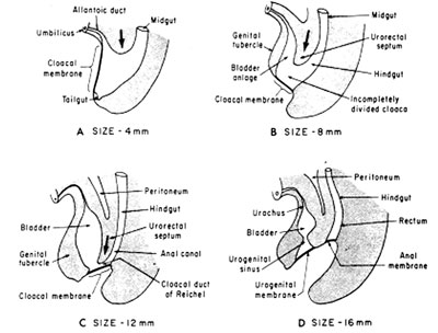 Όπως είναι γνωστό, η αμάρα8,9 αντιπροσωπεύει το τελικό τμήμα του οπισθίου εντέρου. Με την κάθοδο του ουροορθικού διαφράγματος διαιρείται, δημιουργώντας μπροστά την αρχέγονη ουροδόχο κύστη με τον ουρογεννητικό κόλπο και πίσω το ορθό (εικόνα 2). Το στόμιο της αμάρας φράσσεται από μια μεμβράνη, την αμαρική, η οποία αρχικά καλύπτει το κατώτερο, πρόσθιο κοιλιακό τοίχωμα και αποτελείται εξωτερικά από εξώδερμα και εσωτερικά από ενδόδερμα. Το αρχικά ρομβοειδές σχήμα της μετατρέπεται σε επίμηκες από την ανάπτυξη του μεσεγχύματος προς το κέντρο και τη συγχώνευση των γεννητικών λοφίσκων στο ανώτερο τμήμα της (4ηΠ7η εβδομάδα). Μετά την ολοκλήρωση της καθόδου του ουροορθικού διαφράγματος (8η εβδομάδα), το κατώτερο εναπομείναν τμήμα της αμαρικής μεμβράνης υφίσταται διάτρηση, δημιουργώντας τα ανοίγματα του πρωκτού και του ουρογεννητικού κόλπου.