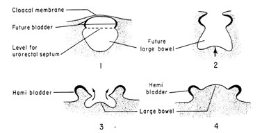 Εικόνα 3. Cloacal membrane=αμαρική μεμβράνη, Level of urorectal septum=επίπεδο του ουροορθικού διαφράγματος, Hemibladder=ημι ουροδόχος κύστη, Future large bowel=μέλλον παχύ έντερο