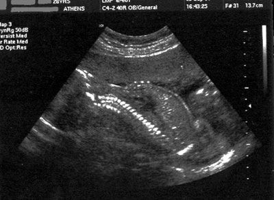 Αξίζει να σημειωθεί ότι από τα 22 περιστατικά της ίδιας μελέτης15 σε 2 διαγνώστηκε μόνο ο εξόμφαλος, σε ένα γαστρόσχιση και σε 3 δεν αναγνωρίστηκε το σύνδρομο, ενώ σε μεταχρονολογημένη επανεξέταση των δεδομένων τους αποδείχθηκε ότι είχαν τουλάχιστον τα 3 από τα 4 μείζονα κριτήρια. Στο περιστατικό της μελέτης μας ο προγεννητικός υπερηχογραφικός έλεγχος θεωρήθηκε φυσιολογικός και έτσι δεν κατέστη εφικτός ο προγραμματισμός του τοκετού. Έγινε υπερηχογράφημα αυχενικής διαφάνειας την 12η εβδομάδα κύησης και υπερηχογράφημα δευτέρου επιπέδου την 22η εβδομάδα, και αναγνωρίστηκε μόνο η κενή ουροδόχος κύστη (εικόνα 6).