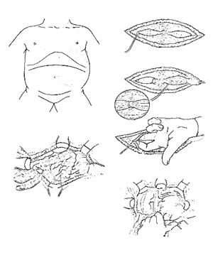 Η εγχειρητική προσπέλαση είναι διαπεριτοναϊκή με εγκάρσια δεξιά ή αριστερή υπομφάλια
