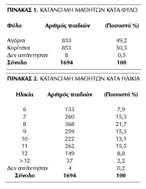 Η κατανομή των 1694 μαθητών κατά φύλο και ηλικία παρουσιάζεται αντίστοιχα στους