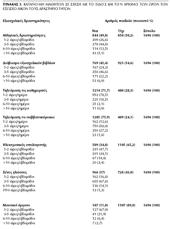 το είδος των εξωσχολικών τους δραστηριοτήτων, καθώς και τον αριθμό των ωρών