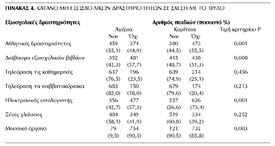 σχέση με τα κορίτσια με αθλητικές δραστηριότητες (p<0,001) και χρήση ηλεκτρονικού